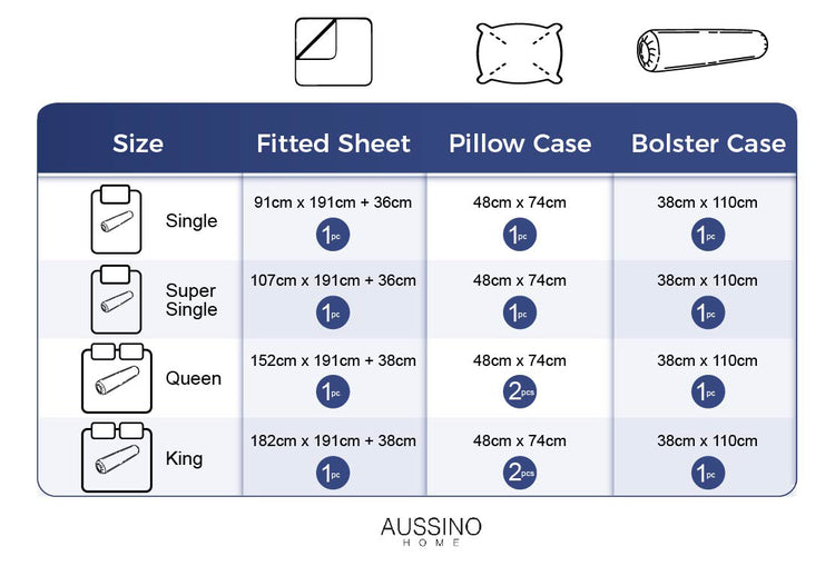 Single - 1x Fitted Sheet 91x 191+ 36cm / 1x Pillow Case 48 x 74 / 1x Bolster Case 38 x 110cm