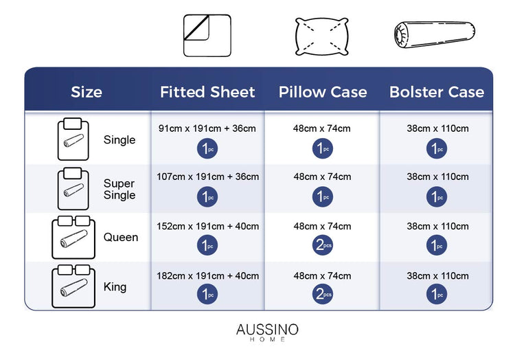 Super Single - 1x Fitted Sheet (107 x 191+ 36cm height) / 1x Pillow Case (48 x 74cm) /